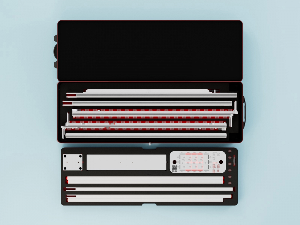 Jedes Teil ist eindeutig beschriftet, sodass sich sein Platz im Hartschalenkoffer leicht finden lässt. Exakt angepasste Schaumstoffeinlagen mit passenden Fräsungen schützen alle Systemteile im Inneren des Koffers vor Transportschäden