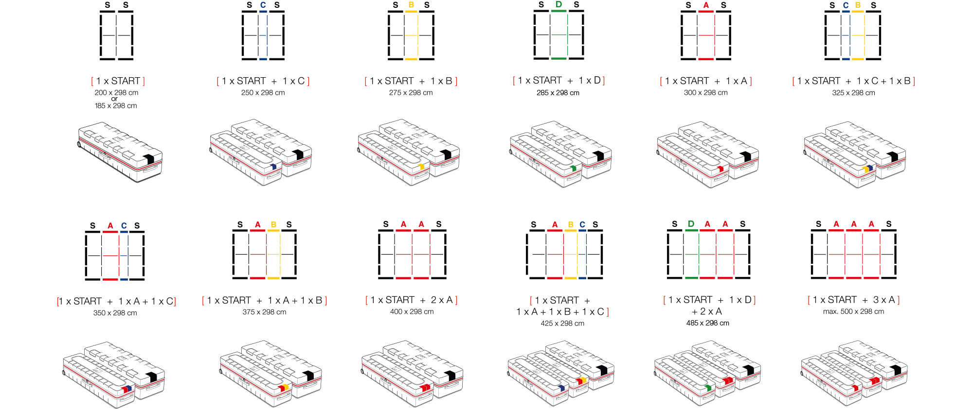Mit einem zweiten Starterset, bei dem die Ecken durch ein Verbindungsstücke ersetzt werden, ist sogar ein Aufbau mit einer Gesamtbreite von bis zu 1000 cm möglich. Zudem stehen verschiedene Höhen von 200 cm, 230 cm, 248 cm und 298 cm zur Auswahl.