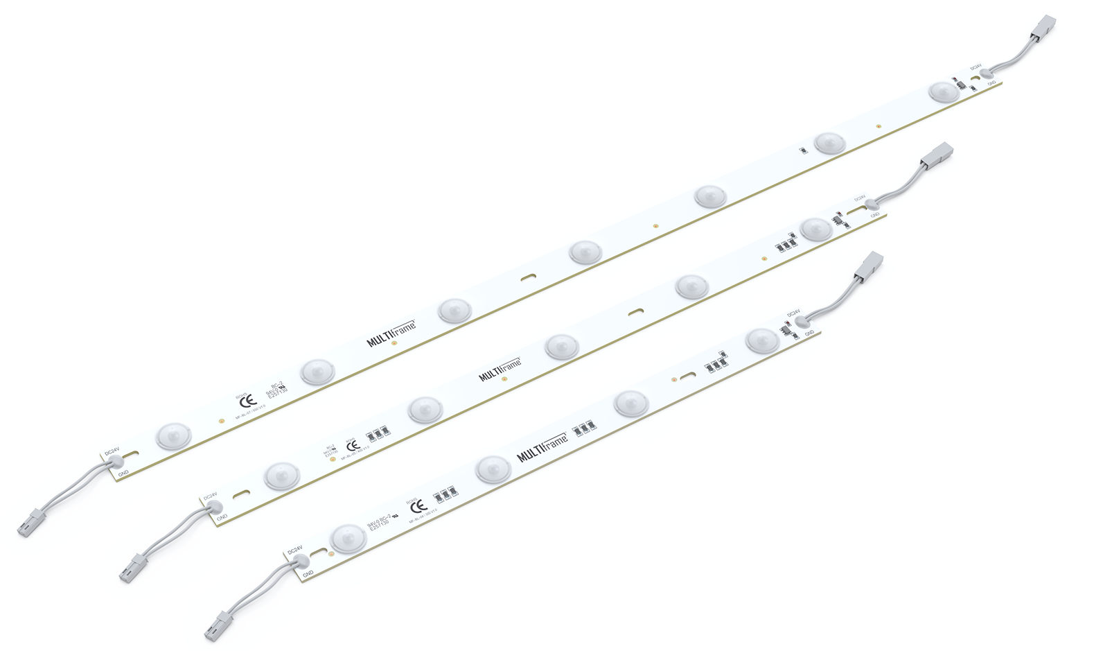 Durch die Verwendung hochwertiger OSRAM-LED-Technologie in Kombination mit optimal abgestimmten Linsen werden folgende Ergebnisse erzielt: ca. 7000 lm, ca. 45 Watt/m², ca. 1600 cd, Farbtemperatur 6000 Kelvin. Diese Daten zeigen, dass die Multi Frame Super Slim 35/65 Rahmen, die primär zur Hintergrundbeleuchtung von Bildern verwendet werden, auch allein zur Beleuchtung eingesetzt werden können. Das modulare Design der LED-Module ermöglicht es, nahezu jede Rahmengröße gleichmäßig und hell ohne Hotspots zu beleuchten.