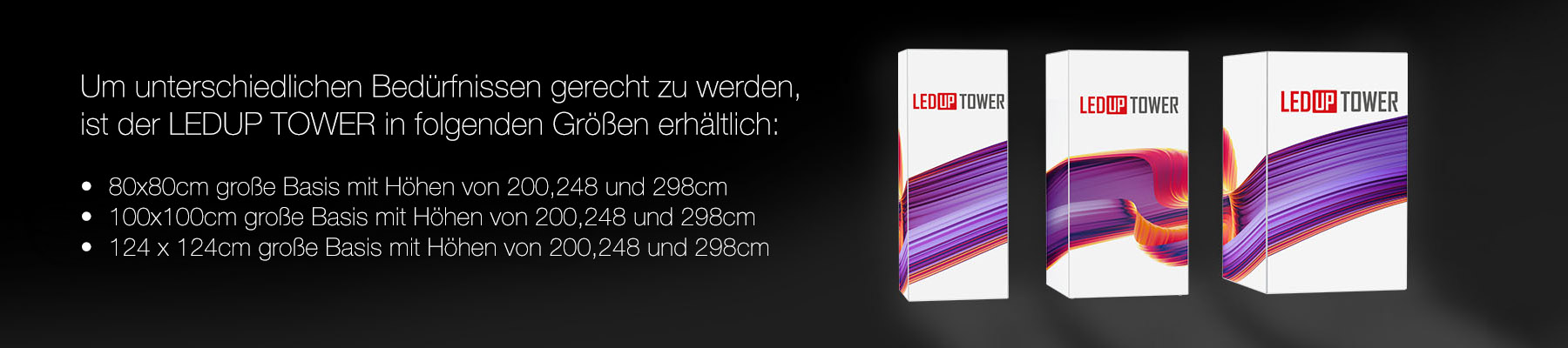 Erhöhen Sie Ihre Präsentation mit dem beeindruckenden LEDUP Tower! Jede Seite dieses innovativen Turms ist brillant beleuchtet und sorgt für einen atemberaubenden visuellen Effekt. Wählen Sie aus einer Reihe von Breiten (80, 100, 124) und Höhen (200, 248, 298), um Ihren Bedürfnissen perfekt zu entsprechen und einen bleibenden Eindruck zu hinterlassen.